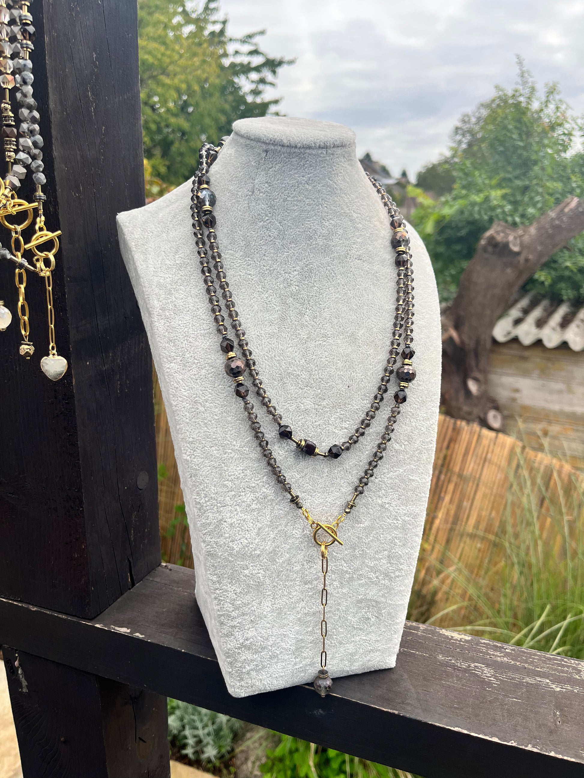 - medžiagos: vintažinio stiklo detalės, žadeito akmuo, hematito akmuo, nerūdijančio plieno detalės,